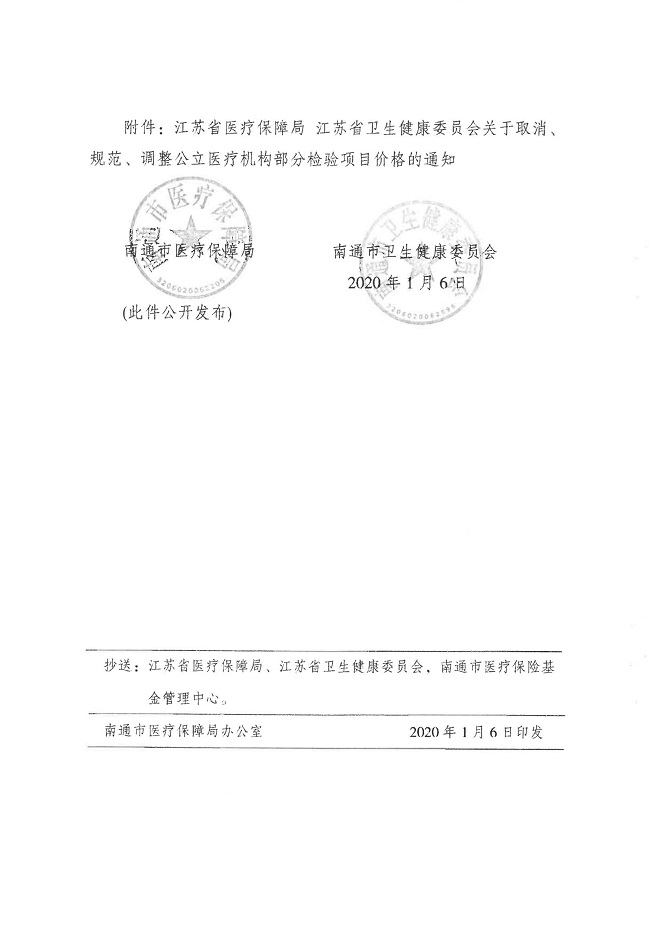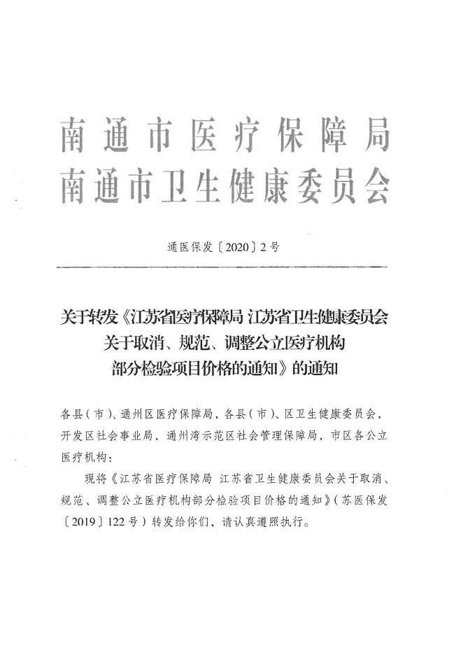 关于转发江苏省及南通市关于取消、规范、调整公立医疗机构部分检验项目价格政策的通知